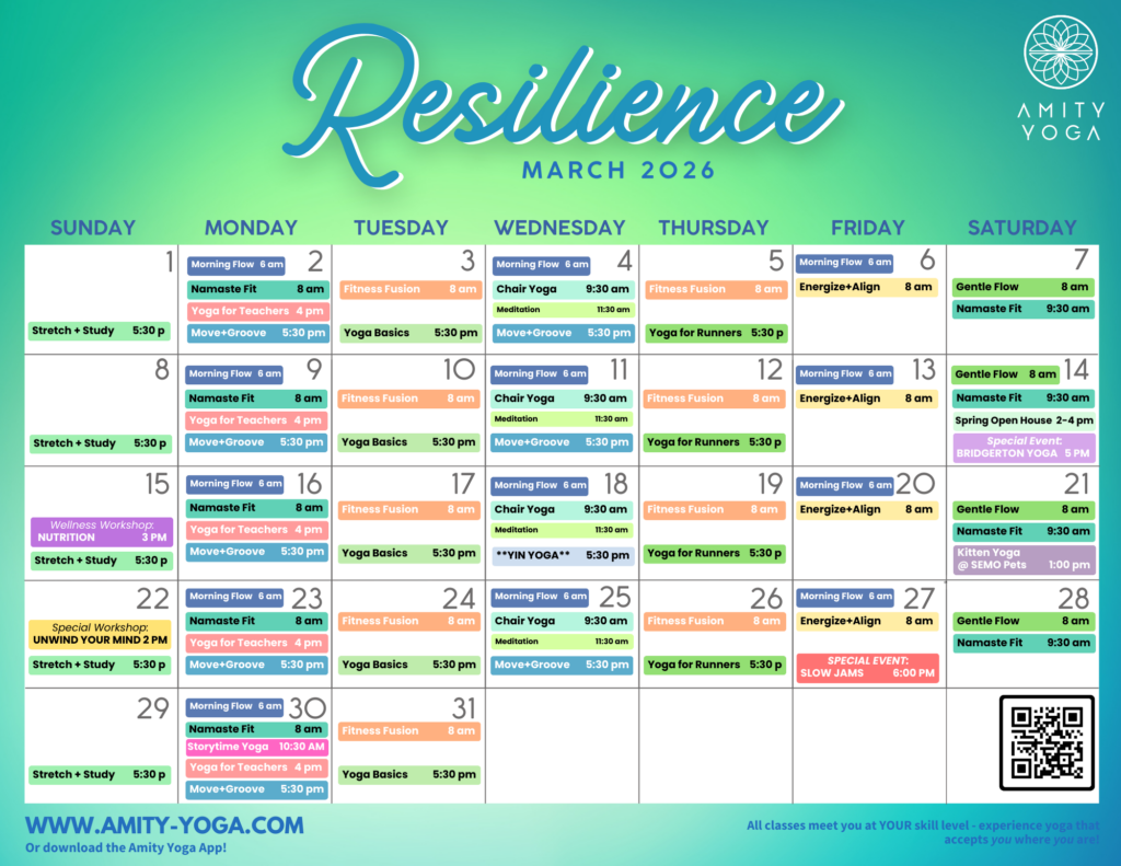 STUDIO SCHEDULE From group flows to private sessions, we’ve got a class for every vibe and stage of your yoga journey! *NEW* + Noteworthy Find Out More + Book Find Out More + Book Find Out More + Book Find Out More + Book Find Out More + Book Full Class Schedule Not sure which class is right for you? Check out our CLASS DESCRIPTIONS HERE. INTERESTED IN PERSONAL TRAINING + PRIVATE YOGA SESSIONS? CLICK HERE! Month at a Glance Download the Calendar Here! 👀 at Next Month: Download the Calendar Here! LOCATION:105 East Adams St.Jackson, MO(next to the Ground-A-Bout) INTERESTED IN PERSONAL TRAINING + PRIVATE YOGA SESSIONS? CLICK HERE! What others are saying about Amity: 📲 Download the Amity Yoga App for easy booking HERE! Check out our NEW STUDENT INTRO OFFER!